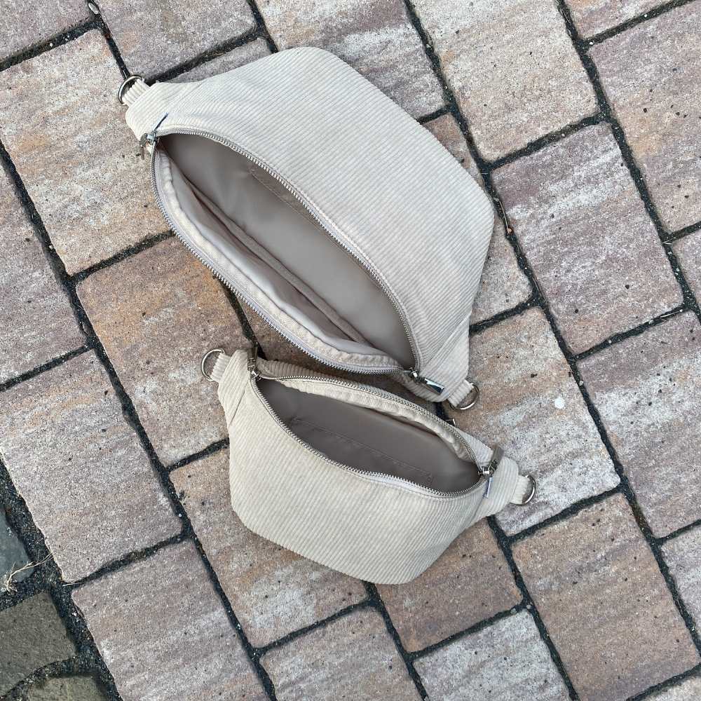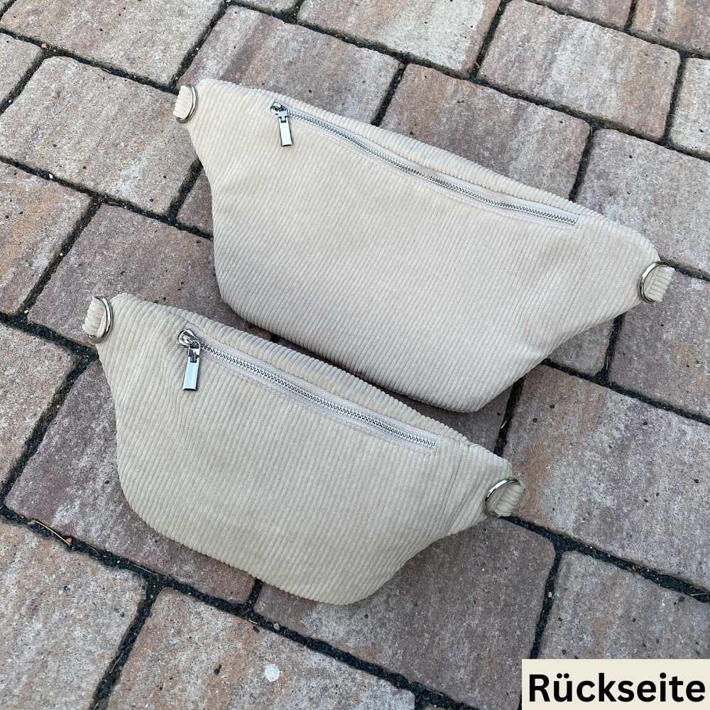 Unsere Bauchtasche aus Cord ist in zwei verschiedenen Größe erhältlich.