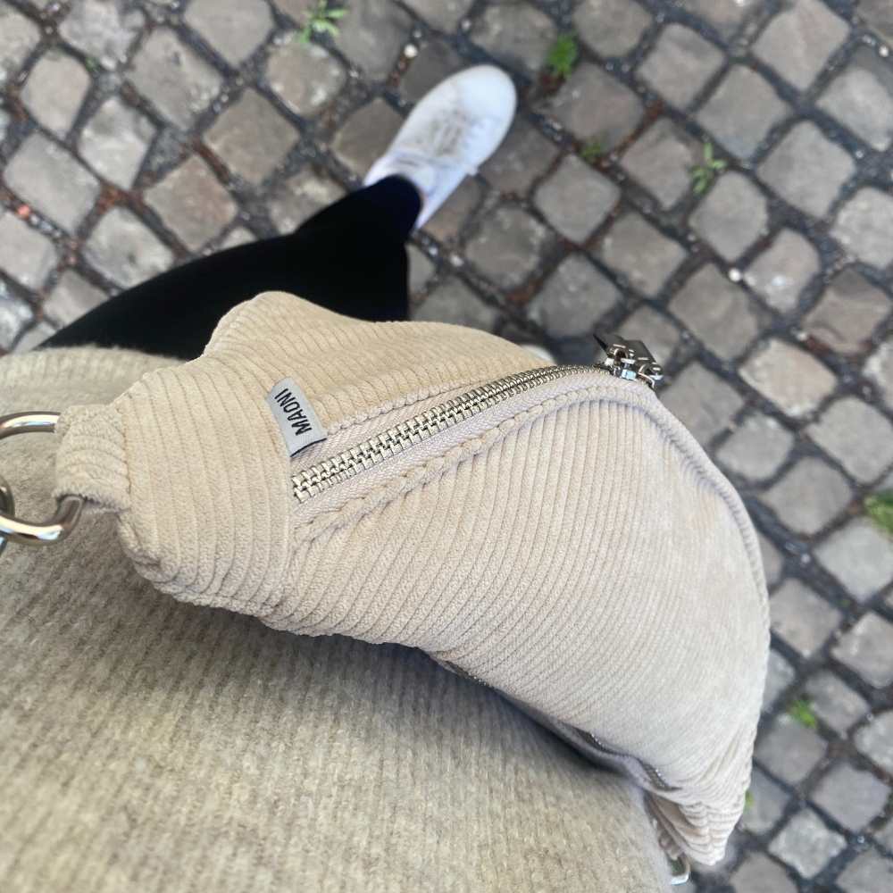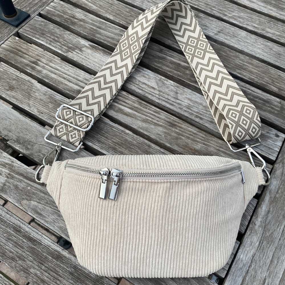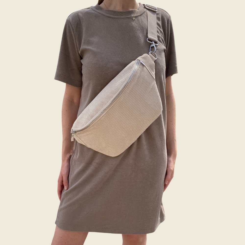 Notre sac banane beige en velours côtelé est livré avec une sangle de sac unie et réglable en longueur.