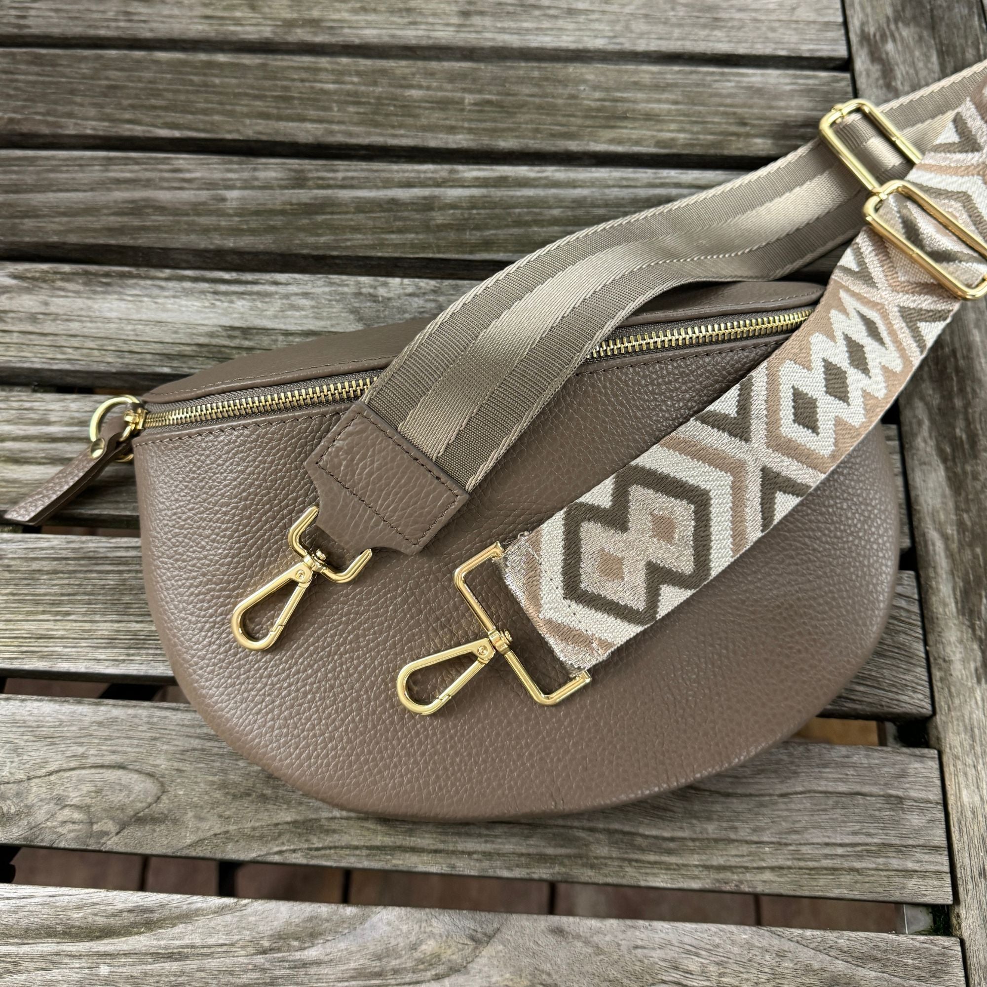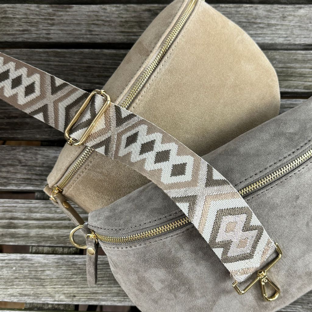 La bandoulière tissée Romina peut être achetée pour aller avec nos sacs banane à fermeture dorée. La longueur de la sangle est réglable.