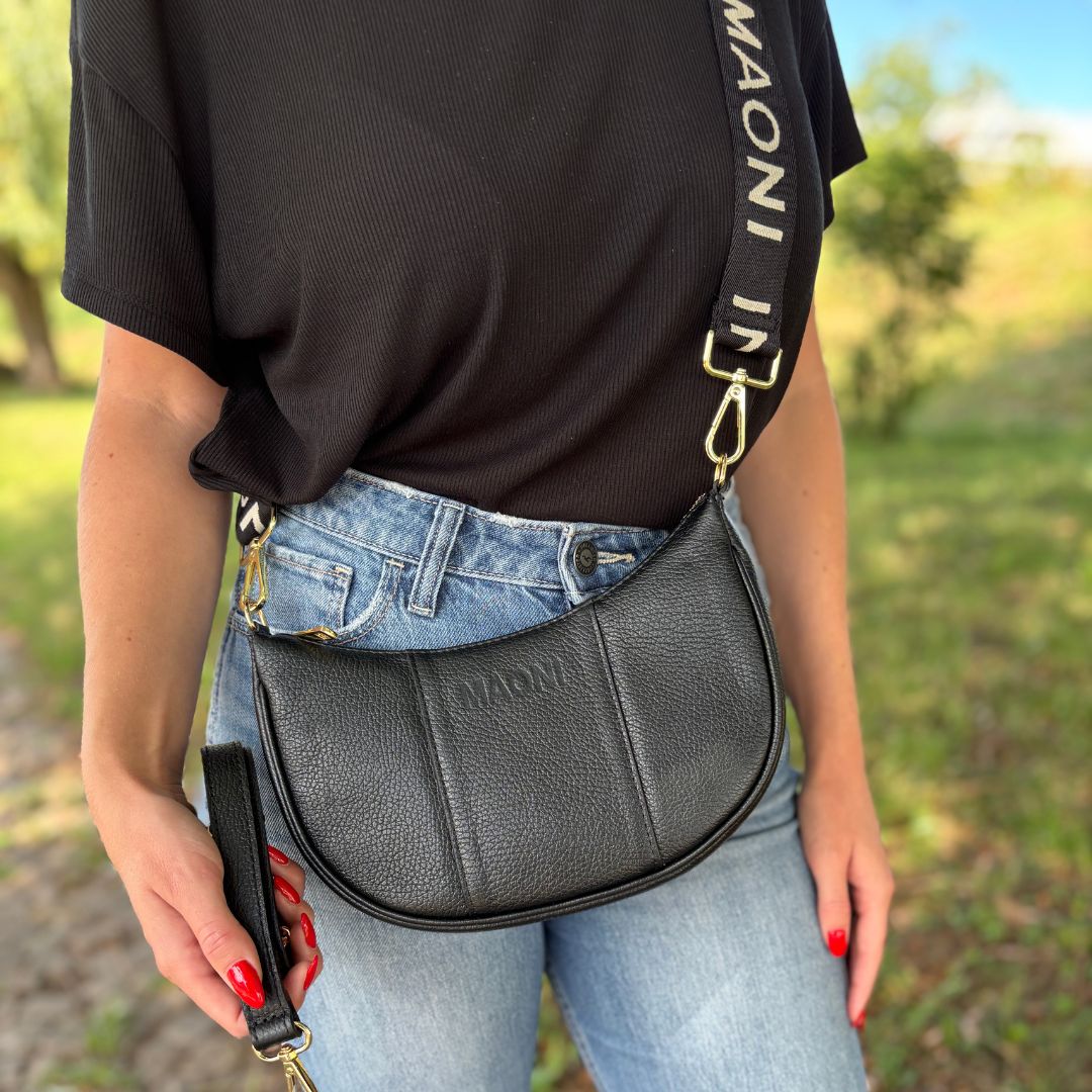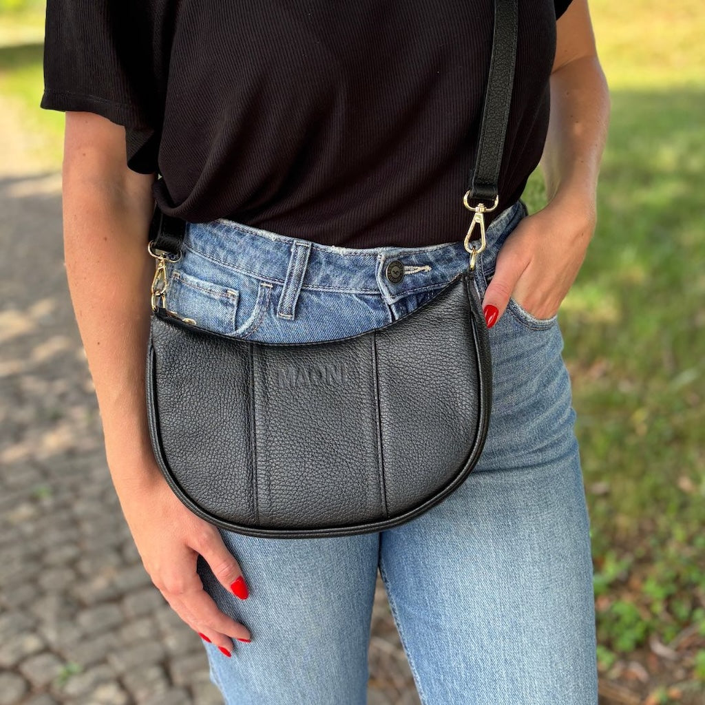 Im Lieferumfang enthalten ist unsere neue Umhängetasche aus Leder und ein schmaler Ledergurt mit goldfarbenem Verschluss. Optional kannst du dir direkt unseren MAONI Gurt mit bestellen.
