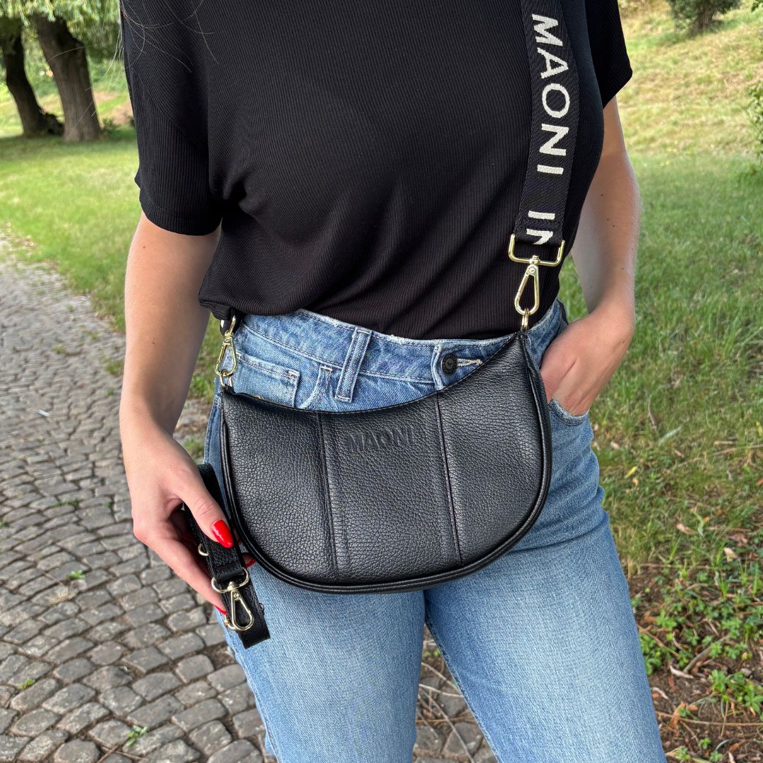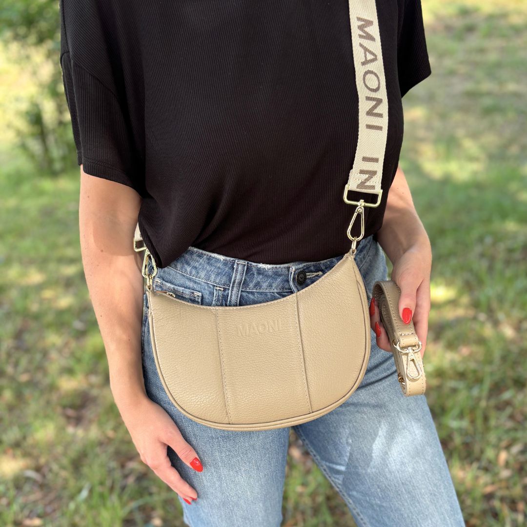 Optional: Im Set MAONI (gold) erhältst du - zusätzlich zum schmalen Ledergurt - einen breiten Taschengurt im MAONI Design.