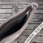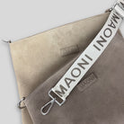 Die Wildleder-Tasche ist in drei Farben (dunkelgrau, dunkeltaupe, beige) erhältlich. Im Innenraum der Tasche befinden sich zwei kleine Reißverschlussfächer. Verschlossen wird die Tasche durch ein durchgängigen Reißverschluss.
