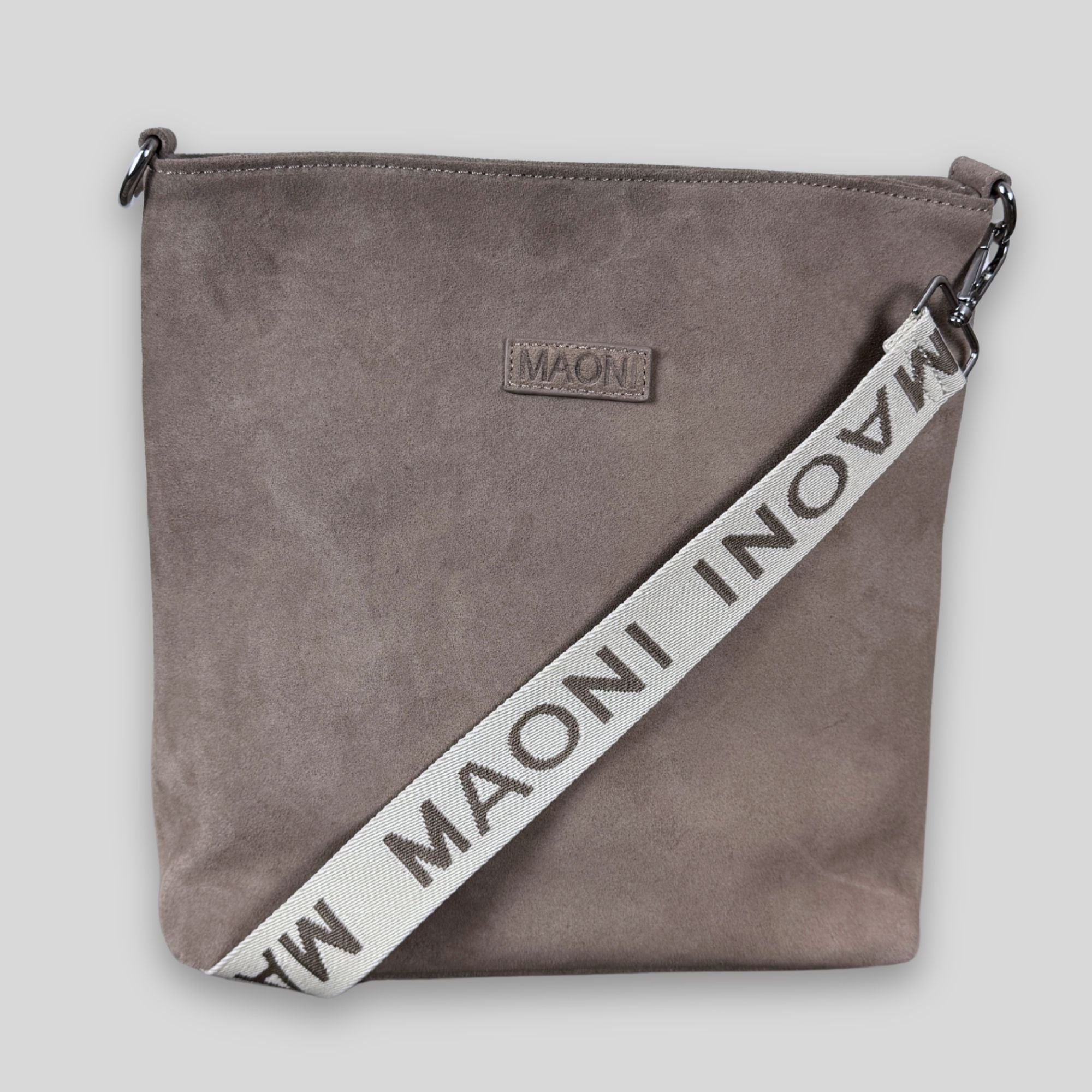 Im Lieferumfang enthalten ist unsere dunkeltaupe Wildleder Umhängetasche inkl. des zweifarbigen MAONI Logo-Gurts und einem weiteren Gurt nach Wahl (Set-Option). Die Gurte lassen sich bis ca. 140 cm verstellen.