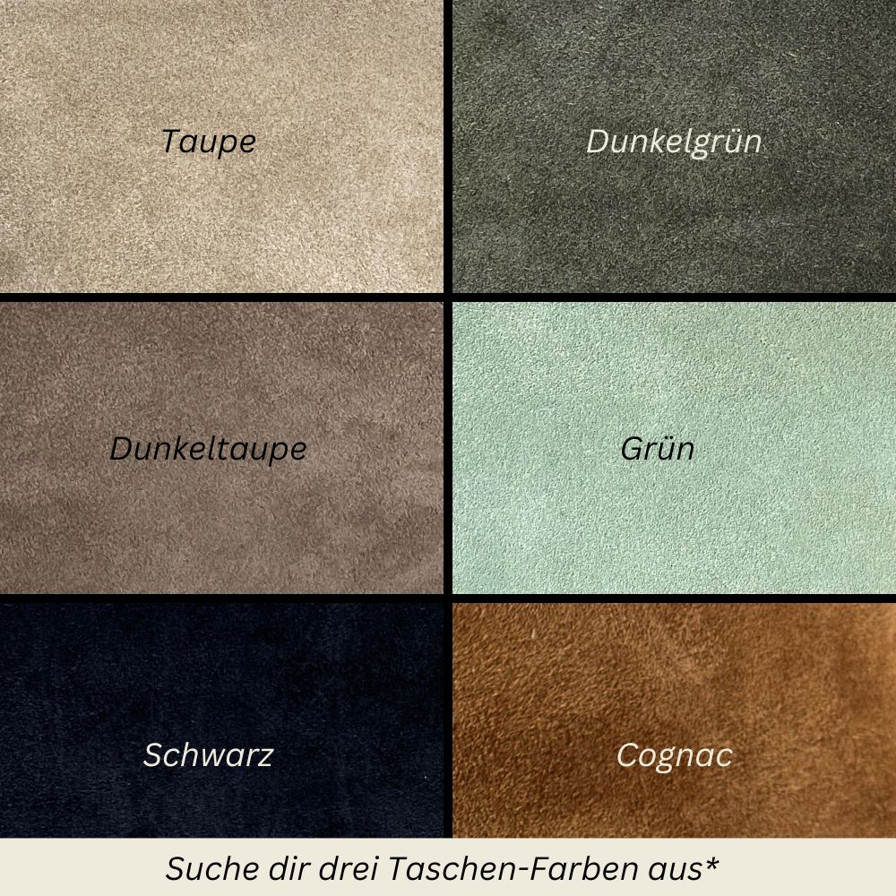 Unsere 3er Wildleder-Box enthält drei kleine Wildledertaschen und einen Taschengurt Mira / schwarz beige. Es handelt sich um Produkte (B-Ware), die bei der Produktion nicht so gelungen sind wie sie sollten aber dennoch wunderschön sind.