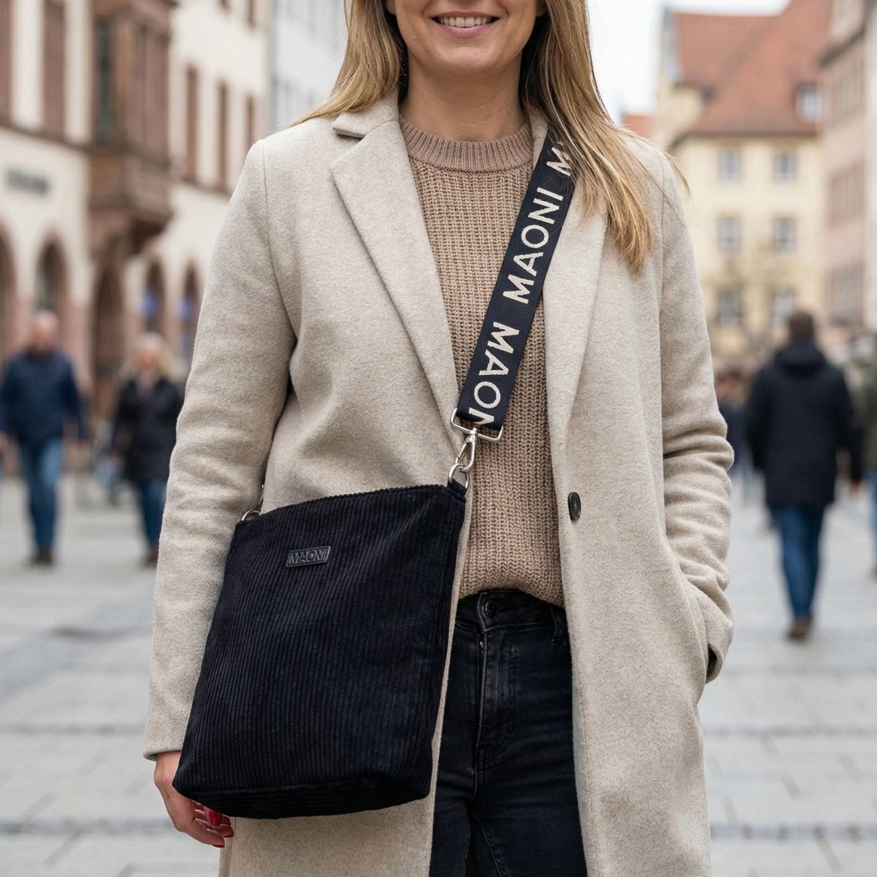 Im Lieferumfang enthalten ist unsere Cord Umhängetasche inkl. des zweifarbigen MAONI Logo-Gurts und einem weiteren Gurt nach Wahl (Set). Die Gurte lassen sich bis ca. 140 cm verstellen.