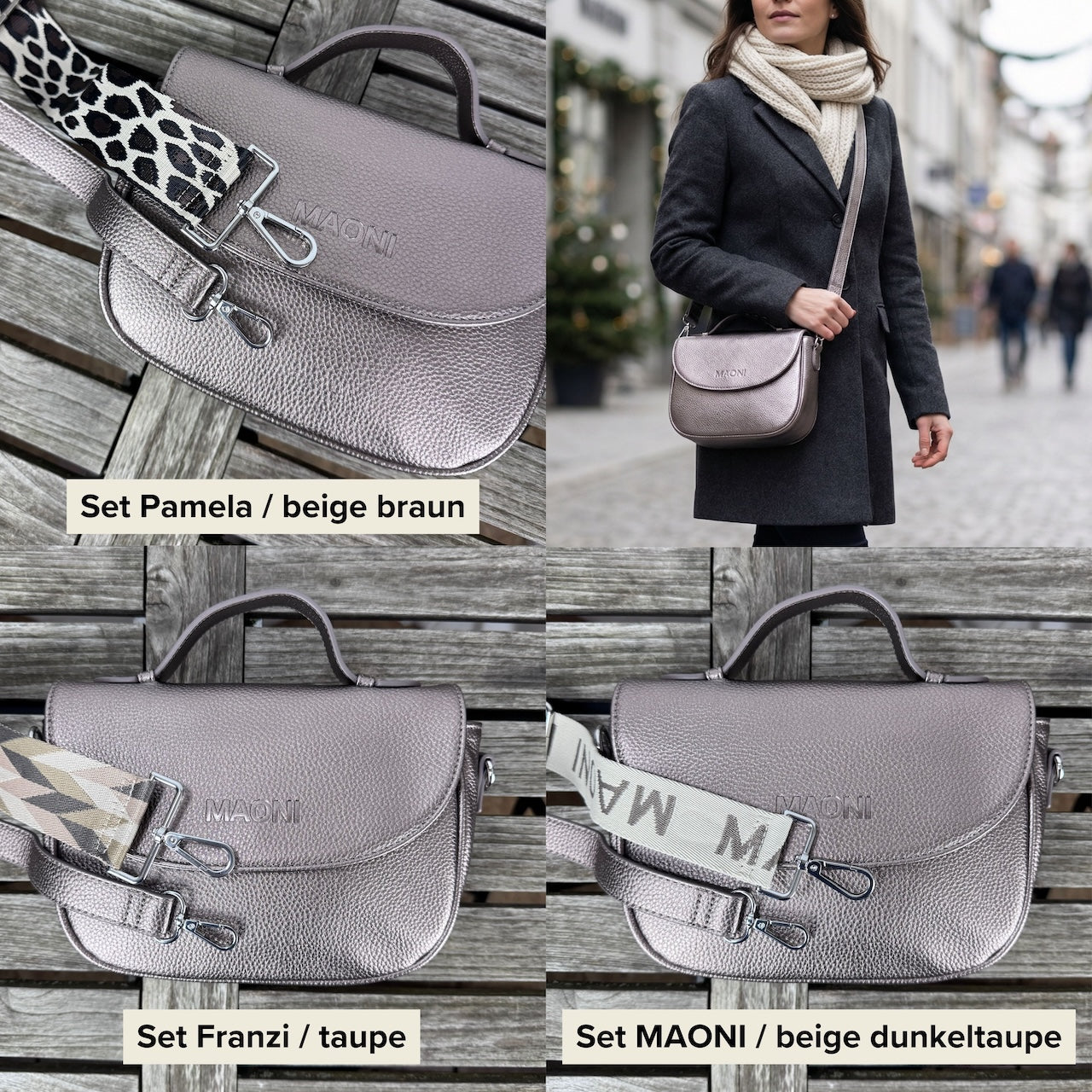 Im Lieferumfang enthalten ist eine Halfmoon-Tasche in der Farbe Metallic Bronze inklusive schmalem Taschengurt in Taschenfarbe und einem breiten Taschengurt nach Wahl.